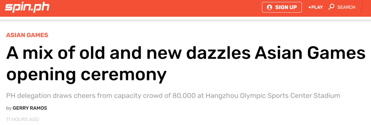 菲律宾体育互动新闻网(SPIN)报道称,杭州亚运会于周六晚上在座无虚席的杭州奥体中心体育场举行了令人目炫的开幕式。 丰富的中国文化融入现代科技,节目持续约两个小时,采用数字科技,在传统的主火炬点燃时,一个巨大的数字动画火炬手同奥运游泳冠军汪顺共同点燃了圣火。