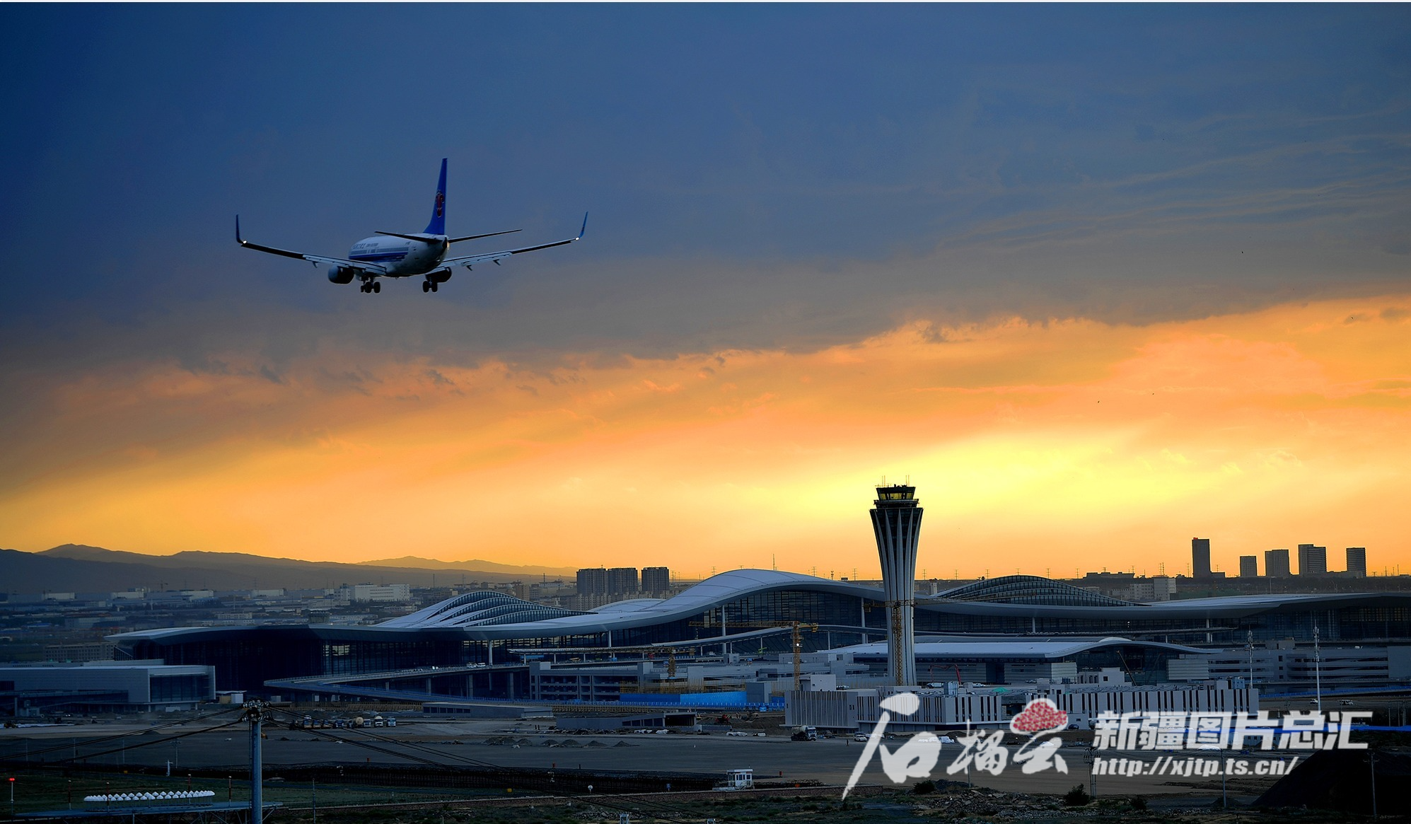 7月10日傍晚,一架客机飞过乌鲁木齐机场改扩建工程T4航站楼上方。天山网-新疆日报记者 邹懿 摄