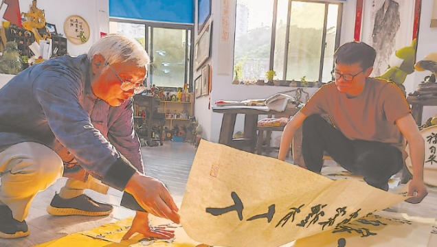曹原彰和儿子在厦门工作室整理书法作品,准备选送参加两岸书画展。