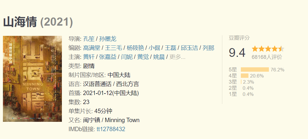 电视剧《山海情》一经播出就连续登上微博热搜,“豆瓣”评分达到9.4的高分。除了高分,观看这部剧的网友也给出了很好的评价,在这部剧的带动下,1月12日至1月20日,“闽宁镇”话题搜索指数环比上涨561%。这部剧是以福建省与宁夏自治区进行的“东西协作”扶贫项目为背景,讲述了宁夏西海固地区的移民们在国家政策的帮扶下,群策群力,将风沙走石的“干沙滩”建设成寸土寸金的“金沙滩”的故事。
