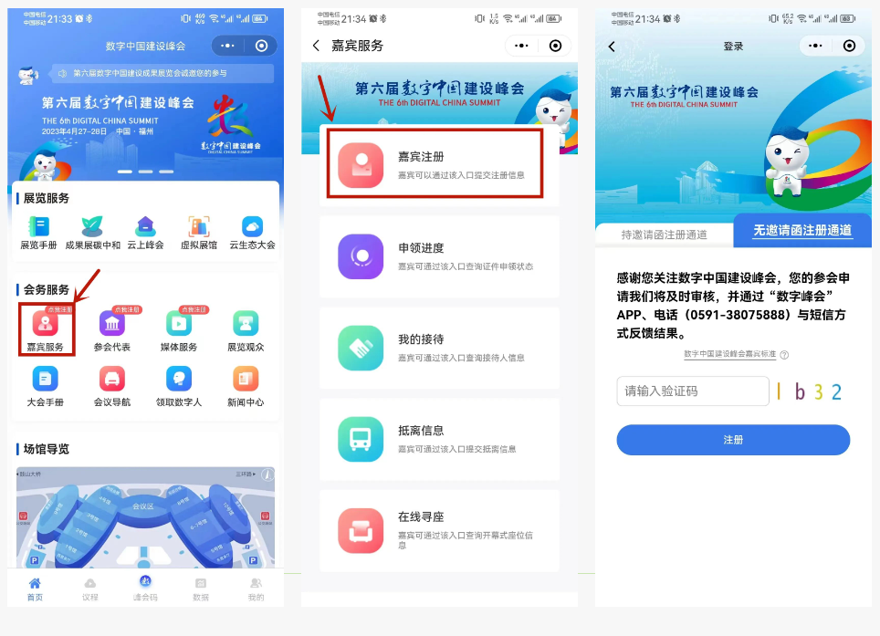 第六届数字中国建设峰会无邀请函嘉宾注册通道即将关闭!大家都报名了吗? 本届峰会无邀请函嘉宾报名注册时间截至4月20日00:00!欢迎从事数字中国建设的相关行政事业部门负责人,高等院校领导,智库和研究机构、行业协会(民政部备案)代表、专家学者,数字经济领军企业负责人,以及其他在数字经济领域作出一定贡献的代表性人员报名注册! 以下三种方式任选其一即可报名注册。 报名方式 NO.1 官网 (1)通过数字中国建设峰会官网(www.szzg.gov.cn)进入嘉宾注册界面,点击“注册账号”,有邀请函的进入“持邀请函注册通道”,无邀请函选择“无邀请函注册通道”。